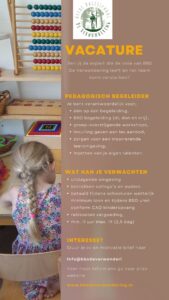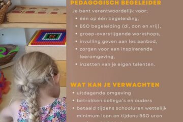 Een collega met pedagogisch talent en papieren om te werken op de buitenschoolse opvang. Iemand die ieder kind ziet en het de ruimte geeft om competent te zijn. Je hebt ervaring met en kunt werken in combinatiegroepen. Je erkent en weet het verschil tussen leiden en begeleiden. Je bent leerbaar en wilt het goede doen, juist vanuit de ogen van het kind. Maatschappelijk verantwoord, duurzaam en pionieren zijn je op het lijf geschreven. Je bent minimaal 2 dagen per week beschikbaar voor werk.